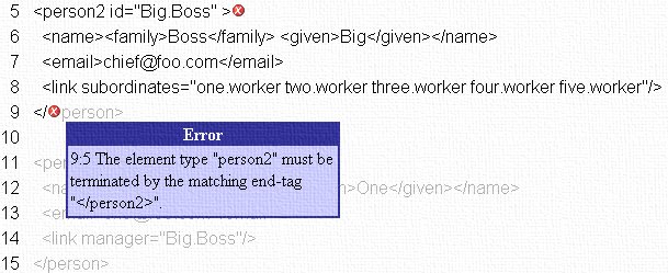 If errors are found in any of these files, they are marked in the text with icons. If you point at one of these icons with your mouse, the error is desribed in a popup window: